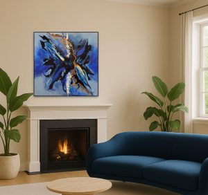 La forme centrale évoque selon la sensibilité de chacun, une aile déployée, une explosion cosmique ou encore une métamorphose intérieure. Le contraste entre le bleu apaisant et l’orange incandescent traduit la tension entre sérénité et passion, entre contrôle et impulsion.
