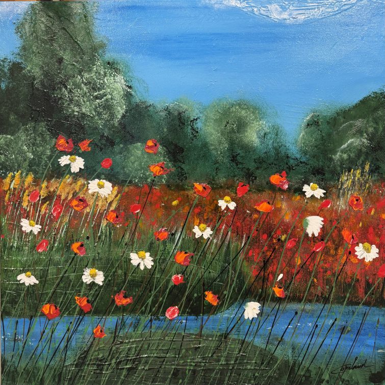 Cette nouvelle série (Fleurs 2018) se veut toute différente de mes abstractions. Elle est dédiée à ma mère, cette femme exceptionnelle qui adorait les fleurs, la nature et les campagnes de chez nous. Elle était forte comme la nature, belle comme les fleurs. Ma mère savait rendre la vie belle, même dans les jours les plus sombres. On oubliera jamais ce sourire radieux et enjôleur.Cette série sera un peu comme elle, représentant les petits bonheurs au quotidien, l’envie de courir dans les champs. L’envie d’être heureux et de rendre les autres heureux.