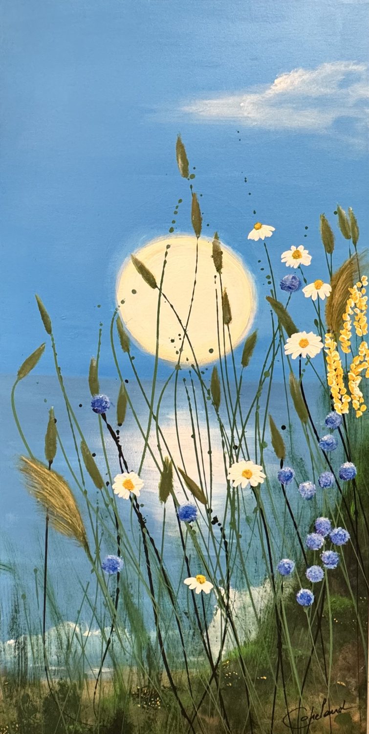 Cette nouvelle série (Fleurs 2018) se veut toute différente de mes abstractions. Elle est dédiée à ma mère, cette femme exceptionnelle qui adorait les fleurs, la nature et les campagnes de chez nous. Elle était forte comme la nature, belle comme les fleurs. Ma mère savait rendre la vie belle, même dans les jours les plus sombres. On oubliera jamais ce sourire radieux et enjôleur.Cette série sera un peu comme elle, représentant les petits bonheurs au quotidien, l’envie de courir dans les champs. L’envie d’être heureux et de rendre les autres heureux.